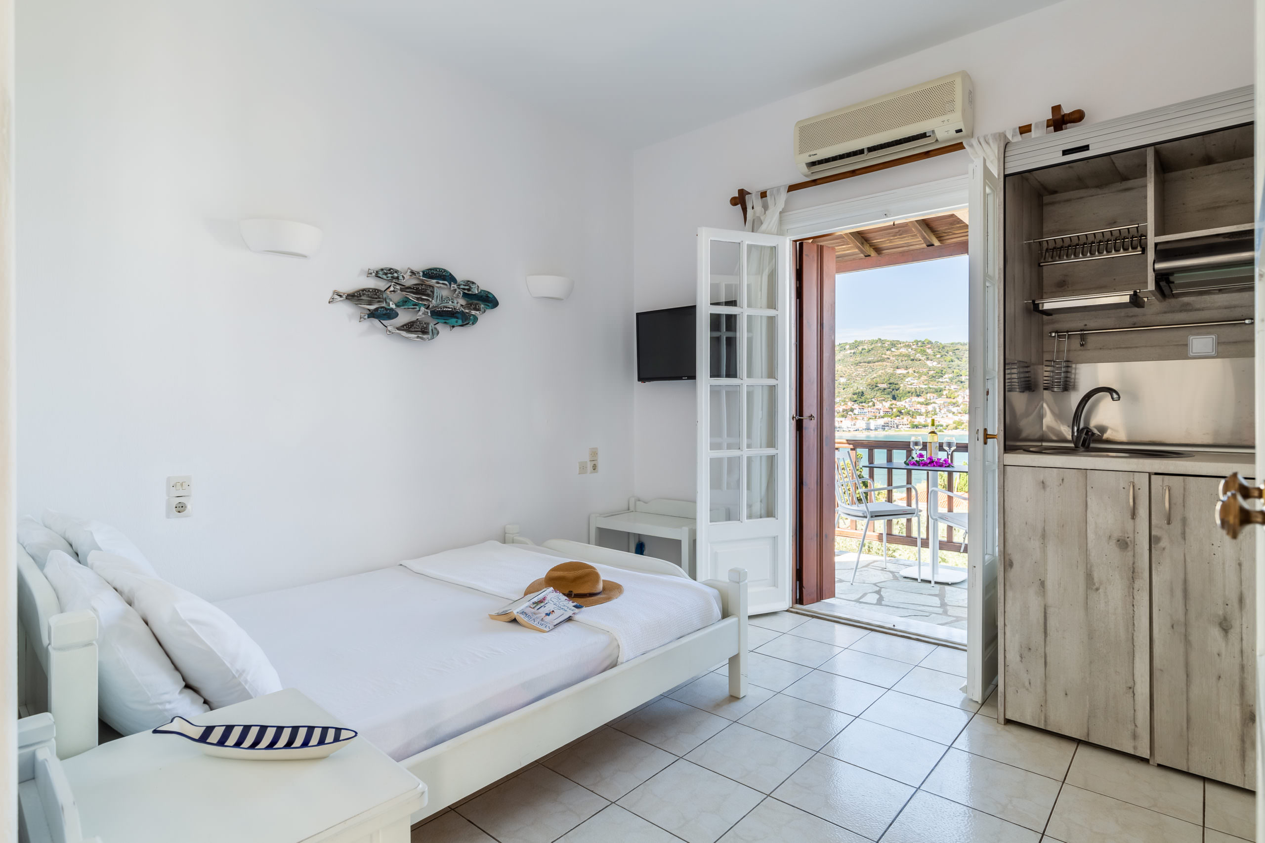 Our outdoor areas feature furniture and amenities designed to make your stay a pleasant experience. The view of the deep blue sea, Skopelos Town, and our beautiful garden will captivate you. These elements make your choice to vacation in our area truly rewarding.