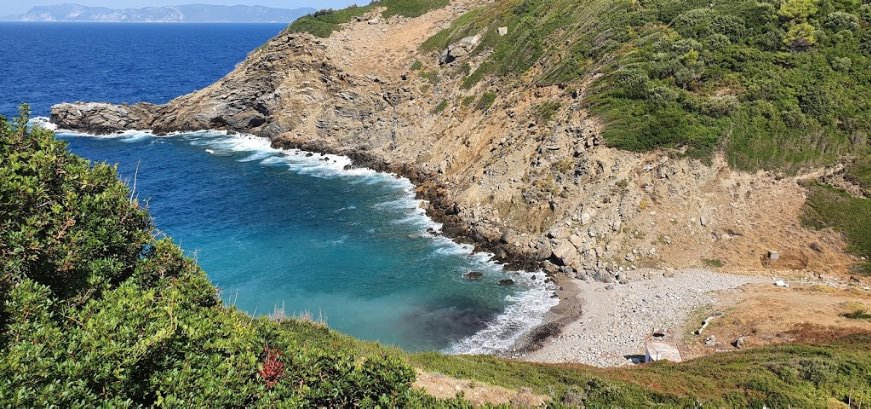 Northern coast cove east of the Glysteri side, with mixed road-and-foot approach.