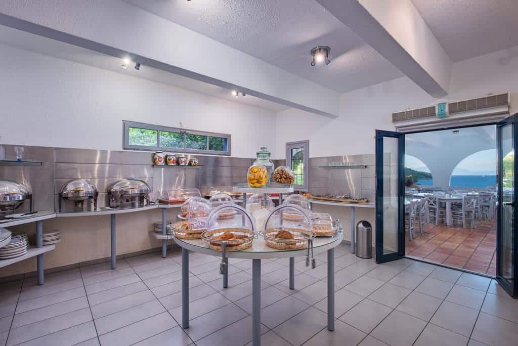 Οι επισκέπτες του ξενοδοχείου Adrina Beach (Αντρίνα Μπητς) στην Σκόπελο μπορούν να απολαύσουν το πρωινό-το οποίο σερβίρεται σε μπουφέ- στην ειδική αίθουσα πρωινού θαυμάζοντας την πανοραμική θέα στην θάλασσα.