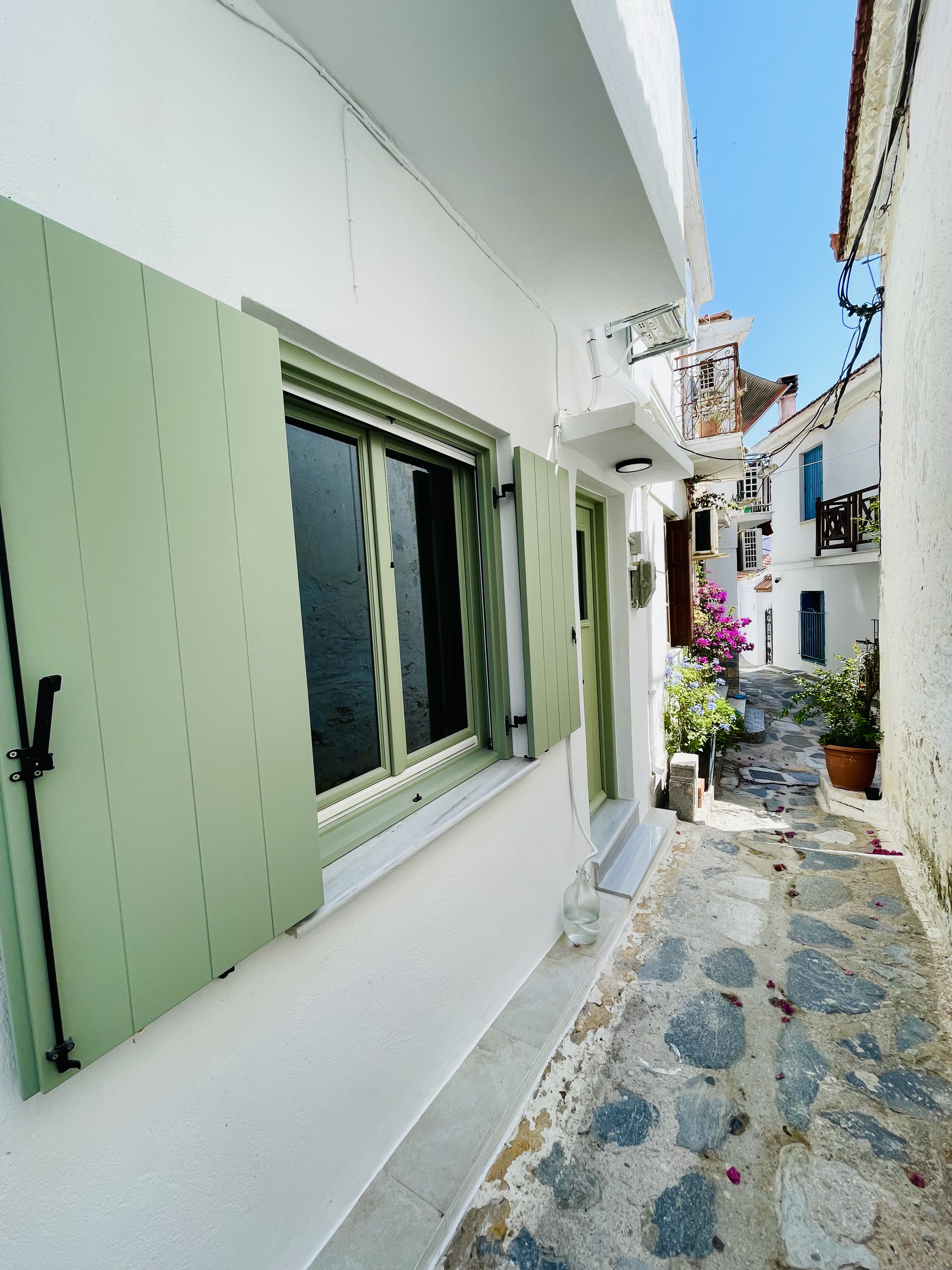 Αυτό το πρόσφατα ανακαινισμένο σπίτι βρίσκεται κοντά στο Κάστρο και την εκκλησία του Χριστού, μια από τις παλαιότερες και πιο γοητευτικές γειτονιές μέσα στο παραδοσιακό χωριό, ανάμεσα στον ασβεστωμένο, ήσυχο λαβύρινθο των σοκακιών του παραδοσιακού χωριού, όπου η αποκομιδή των σκουπιδιών γίνεται ακόμα από έναν άνδρα και το μουλάρι του. Υπάρχουν πολύχρωμα παραθυρόφυλλα, ζωντανά λουλούδια και εκπληκτική θέα σε απόσταση λίγων λεπτών με τα πόδια. Δύο εστιατόρια και μια καφετέρια βρίσκονται σε απόσταση αναπνοής, ενώ το λιμάνι με όλη τη φασαρία του είναι 5 λεπτά με τα πόδια κάτω. Κομψά και με αγάπη ανακαινισμένος, ο χώρος αποτελείται από ένα υπνοδωμάτιο και ιδιωτικό μπάνιο στο ισόγειο, μια μικρή κουζίνα στον επάνω όροφο που οδηγεί σε μια ευρύχωρη εξωτερική βεράντα, και στη συνέχεια σε μια δεύτερη βεράντα με όμορφη θέα στο λιμάνι της Σκοπέλου. Το σκηνικό της βεράντας είναι ιδανικό για πρωινό καφέ, χαλάρωση μετά από μια μέρα στην παραλία, δείπνο στο ύπαιθρο ή παρατήρηση των αστεριών.
