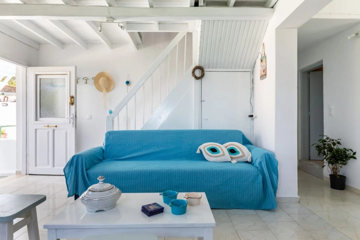 The country house spreads over two floors, combining practical living with island charm. On the ground floor, guests will find a cozy living room with a TV and a large window overlooking Glysteri Beach. The fully equipped kitchen sits next to the living area, allowing you to prepare meals while taking in the peaceful mountain views. The bathroom, located nearby, comes with a shower.