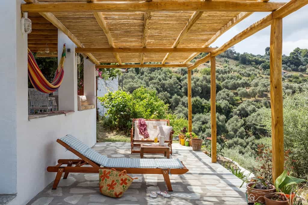 Right across from the Chora of Skopelos, at a height of 250m, in the area of Aghia Marina, you can find the traditional cottage “Anemelia” (Carefreeness).